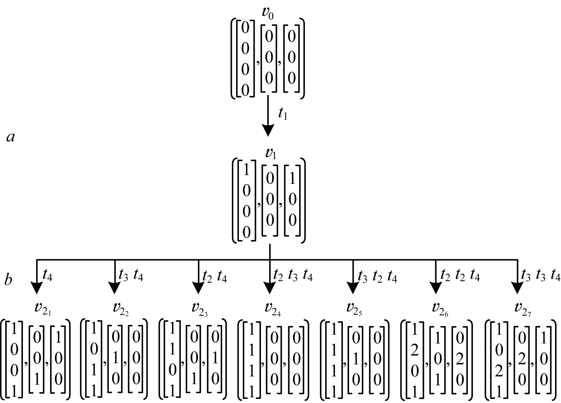 由文献[14]可知,第j阶段的发生数向量的数目为nj=O(j b),b是一个依赖于Petri网结构的参数。给定一个含有n个库所、m个变迁的标注Petri网,其中可观测变迁和不可观测变迁的个数分别为mo和mu,且有m=mo+mu成立。在观察到一个标注后,所有可能不同的不可观测发生数向量的数目为: