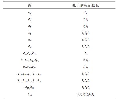 关于Petri网中标识估计问题的研究已经取得显著成果[12-13]。文献[12]基于对标注序列的观察,讨论了初始标识已知的Petri网中的标识估计问题,并指出标识集可用一组具有固定结构的线性不等式来描述。文献[13]也研究了标识估计问题,并证明所有可能的标识数目是关于k的函数。最小初始标识的估计成为当今研究的热点之一,例如文献[14]讨论了含有可观测变迁的标注Petri网中的最小初始标识估计问题,并提出一种最小初始标识估计算法。文献[15]将文献[14]中的结果扩展到含有不可观测变迁的标注Petri网中。文献[16]提出一种用于估计由标注Petri网中的最小代价计划序列的算法。文献[17]通过使用基可达图寻找标注Petri网中最小代价变迁序列。