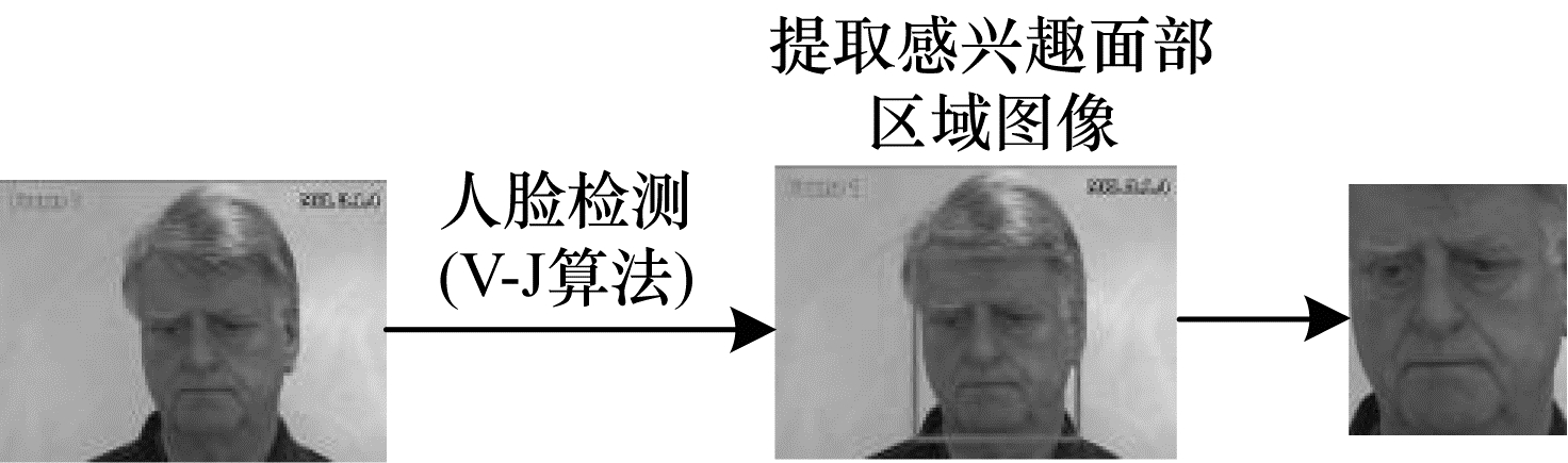 在对疼痛表情图像进行预处理时,可裁剪出感兴趣的面部区域,也能去除额外的背景信息。人脸疼痛表情检测流程如图 1所示,图中的表情帧图像来源于UNBC-McMaster Shoulder Pain数据库[17]。