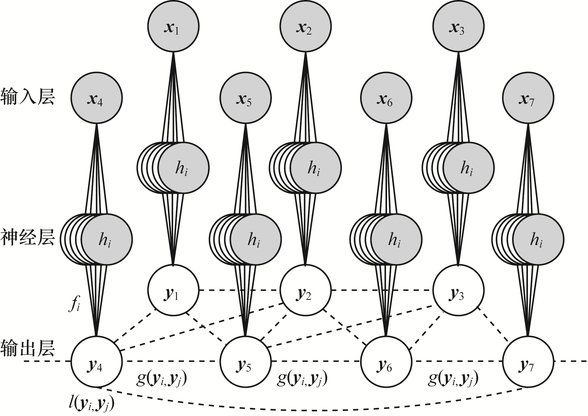 2)Patch模型构建。在PDM模型构建完成后,可以对检测到的人脸图像进行初始化,得到人脸形状模型。接下来让每个点在其周围的邻域范围内进行最佳匹配特征点搜寻,对候选匹配点邻域位置内的图像块实现Patch建模。CLNF模型包括一个基于局部神经域(Local Neural Field,LNF)[19]的新型Patch模型。LNF是一种无向图模型,表示输入(感兴趣区域中的像素强度值)和输出结果(Patch排列概率)间的复杂非线性关系。图 2表示LNF的结构模型图,图中的实线表示顶点特征,用