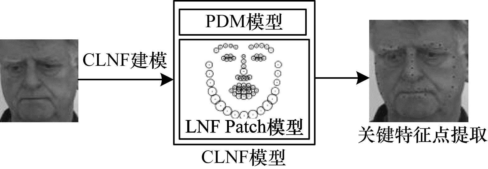 1 基于CLNF模型的疼痛表情特征提取在构建表情识别模型过程中,先对获取的疼痛表情帧图像进行预处理,再进行表情特征提取。即对提取出感兴趣的面部表情区域图像去除冗余信息,利用CLNF模型对图像进行特征点定位。