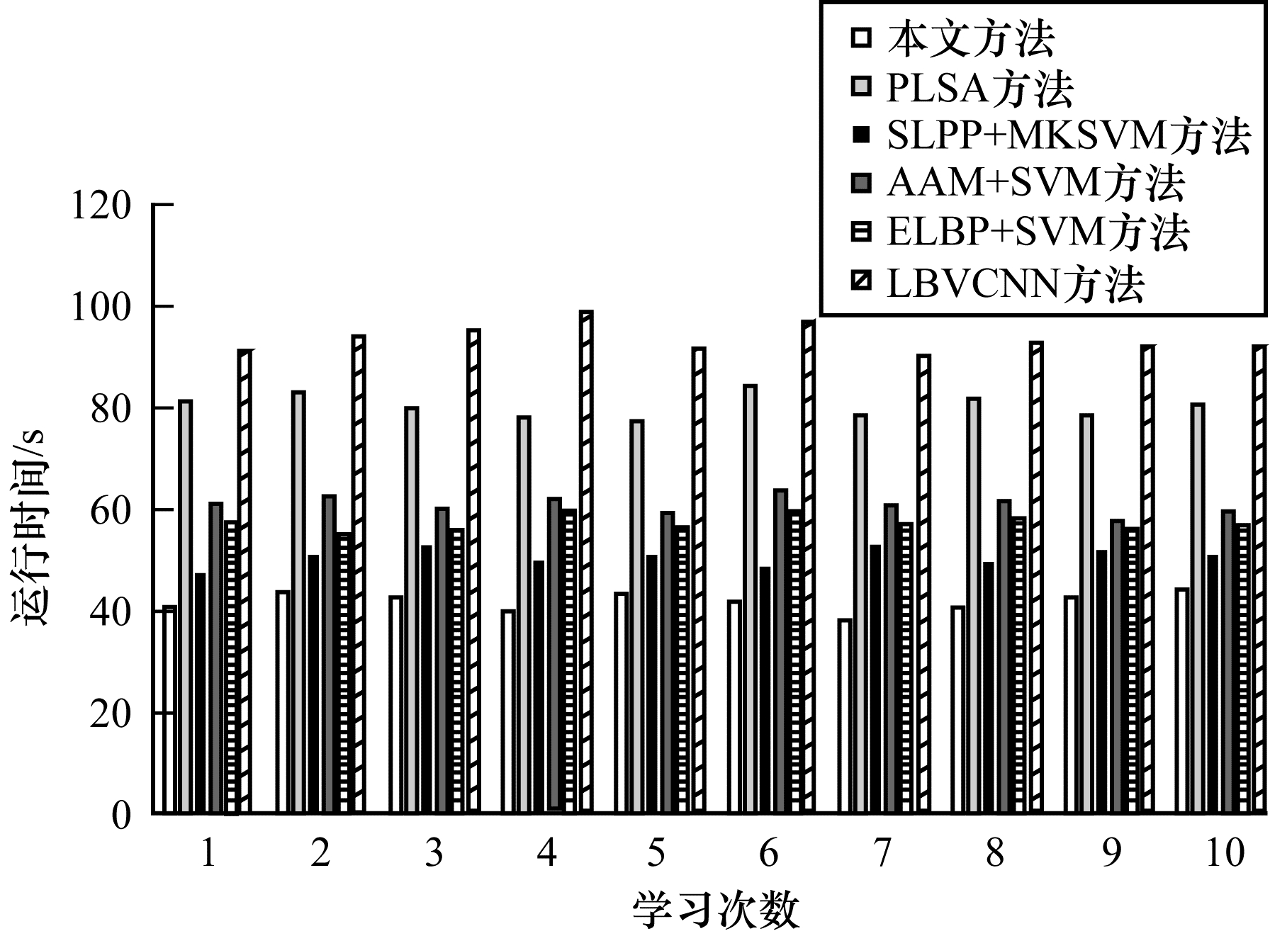 为了进一步验证本文方法的性能,实验对不同方法的运行时间进行对比,结果如图 6所示。从图 6可以看出,本文方法的运行速度比其他5种方法快。