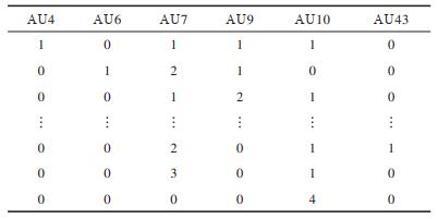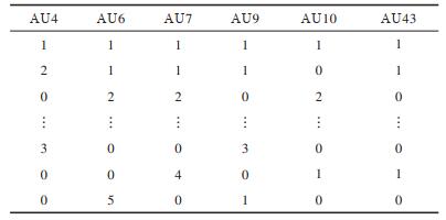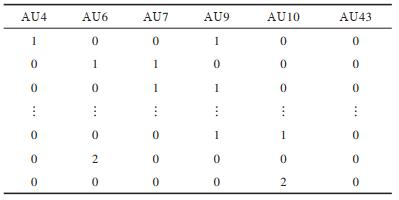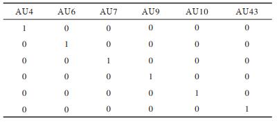 每种PSPI状态值可用6个AU在不同强度评估值下的组合来表现,当PSPI值分别为1、2、4、6时,AU强度评估值的组合情况如表 1~表 4所示。当PSPI值为其他状态值时,AU评估值的组合情况与表 1类似。