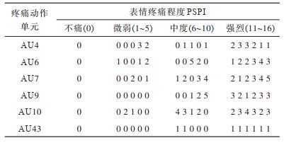 不同的疼痛表情状态可用多种不同的AU强度评估值组合表示,AU组合表示形式如表 5所示。
