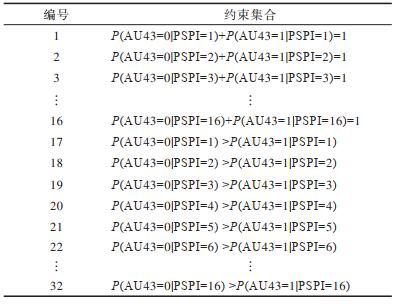 2.2 基于BN建模的疼痛表情识别根据BN结构模型中Pain Expression节点状态与AU节点状态的关系,并结合领域专家的经验可获取以下类似的约束:P(AU43=0|PSPI=1) > P(AU43=1|PSPI=1)。该含义为在表情疼痛程度PSPI=1的条件下,AU43强度评估值为0的概率大于其强度评估值为1的概率。将该约束条件引入BN参数学习机制,并通过改变权重加权的方式与样本数据融合进行参数学习,从而缩小寻优空间,并提高参数估算的精度。