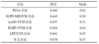 表 9给出了6种方法的PCC与MAE对比结果。从中可以看出,本文方法的PCC取值较大,而MAE取值较低,这说明该方法可以准确地得出疼痛表情的识别结果。