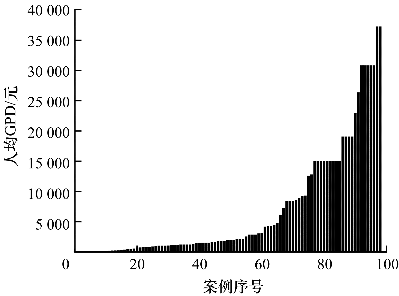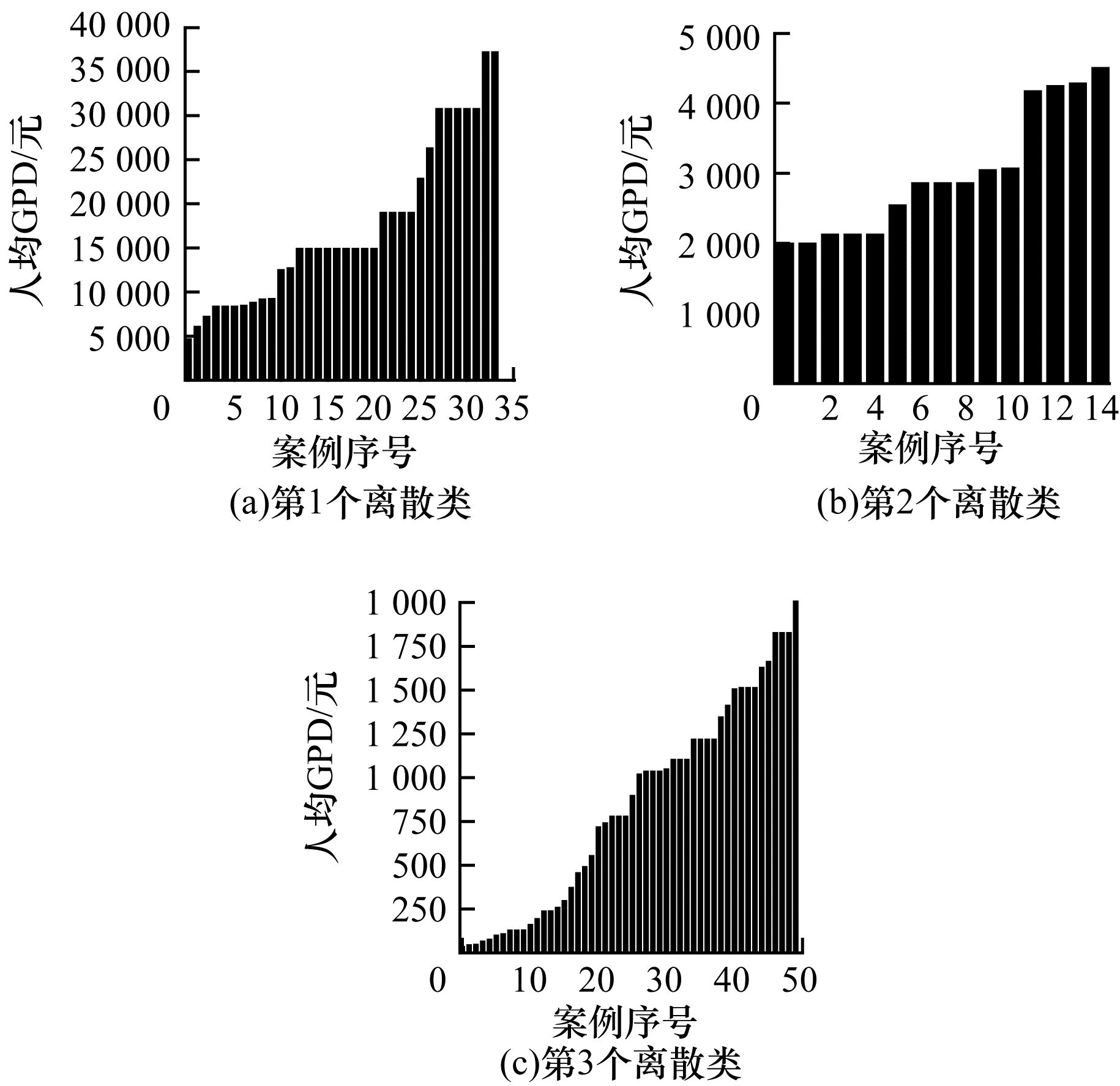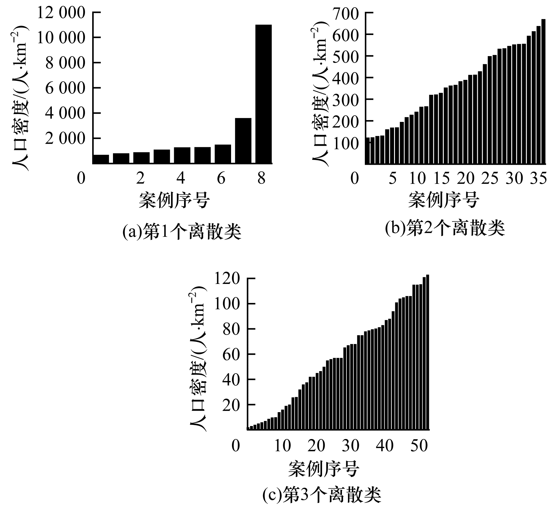 震发地受灾人数的离散、灾区人口密度数据的离散、震发地人均GDP数据的离散等其他类型应急数据的多量级离散化结果如图 12~图 17所示。其中,图 12、图 14和图 16为各类数据未离散时的数据排序,图 13、图 15和图 17为各类数据离散后各离散类的数据分布。可以看出,采用本文方法离散后的数据在各离散类数量区间中分布较均匀,无较大的量级差异。为量化这种均匀性,下文从离散系数分析本文方法的必要性与合理性。