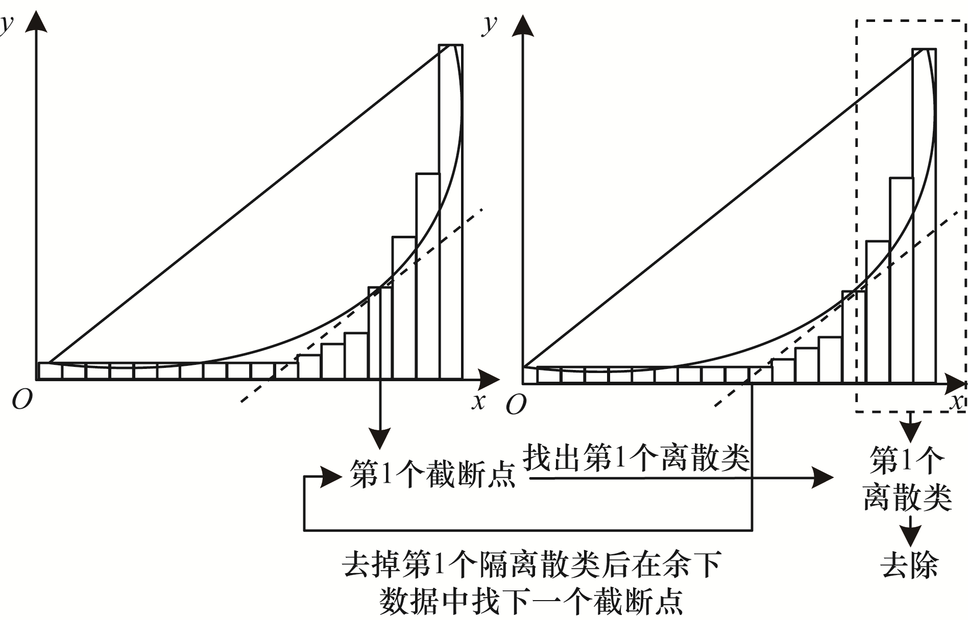 3)根据步骤1和步骤2得到截断点后,从截断点进行数据截断,并将较大的数据归为一个离散类,其他数据重新执行步骤1和步骤2计算下一个截断点,在数据呈现均匀分布后,统计所有离散类作为最终离散化结果。