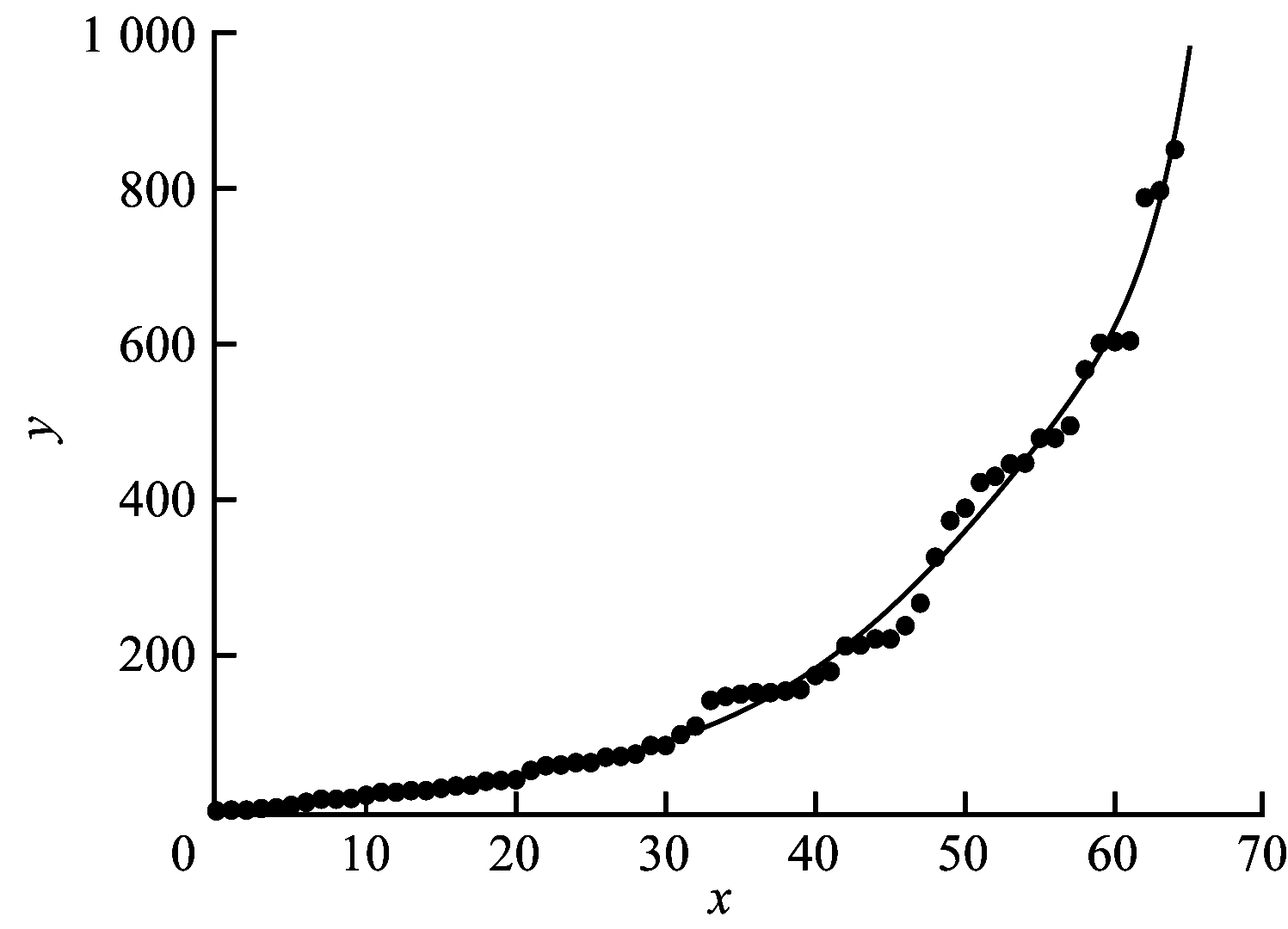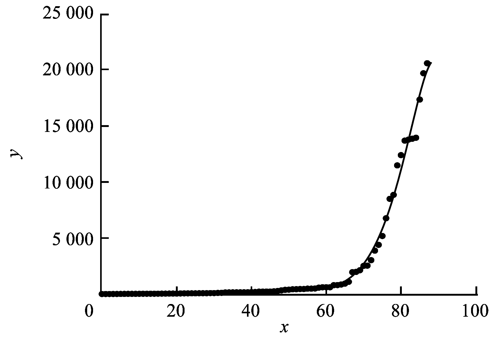 图 4为将地震案例中伤亡人数由小到大排序的结果。为体现图 1中的数据量级差异,从图 4中随机找一个截断点68对较大数据进行截断,剩余数据的分布如图 5所示。由图 5可以看出,去掉部分较大数据后,剩余数据仍呈现指数函数的分布特点,说明数据中存在不止一个数据量级差异。对图 4中按伤亡人数排序的数据进行函数拟合,得到的拟合结果如图 6所示。其中,离散分布的点表示数据值,曲线为数据点的拟合函数曲线。