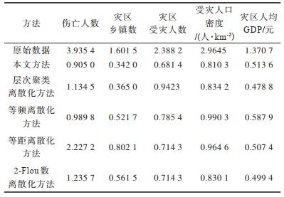 本文设定伤亡人数与受灾人数的离散类个数均为4,其他数据的离散类个数为3,计算得到不同数据集经本文方法、层次聚类离散化方法、等频离散化方法、等距离散化方法以及2-Flou数离散化方法离散后的离散类平均离散系数,其中2-Flou数离散化方法是基于模糊区间与等距离散化的柔性离散化方法[21],采用不同方法得到的5种数据集平均离散系数如表 6所示。