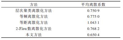 由表 6可以看出,在5种数据集中本文方法的离散系数较其他方法有一定程度的降低,仅在灾区人均GDP数据集中离散系数高于层次聚类离散化方法与等距离散化方法。由于层次聚类与等距离散化方法所得离散系数平均值较高,因此每个离散类包含的数据较少。综合不同数据集的平均离散系数给出各方法的平均离散系数如表 7所示,可以看出本文方法在规定离散类个数下平均离散系数低于其他方法,其各个离散类的数据分布较均匀,证明本文方法具有一定的必要性。