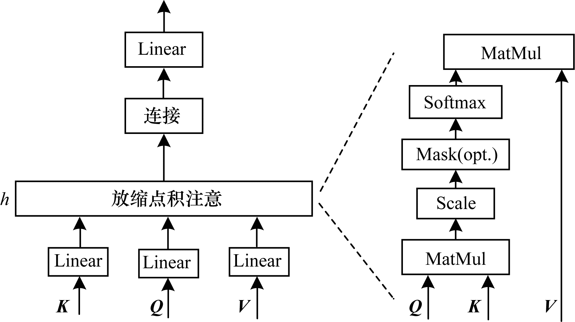 多头注意力机制是将查询向量序列Q、键向量序列K和值向量序列V经过线性变换输入到缩放点积注意中,通过h次缩放点积注意计算后,将计算结果进行合并线性变换。