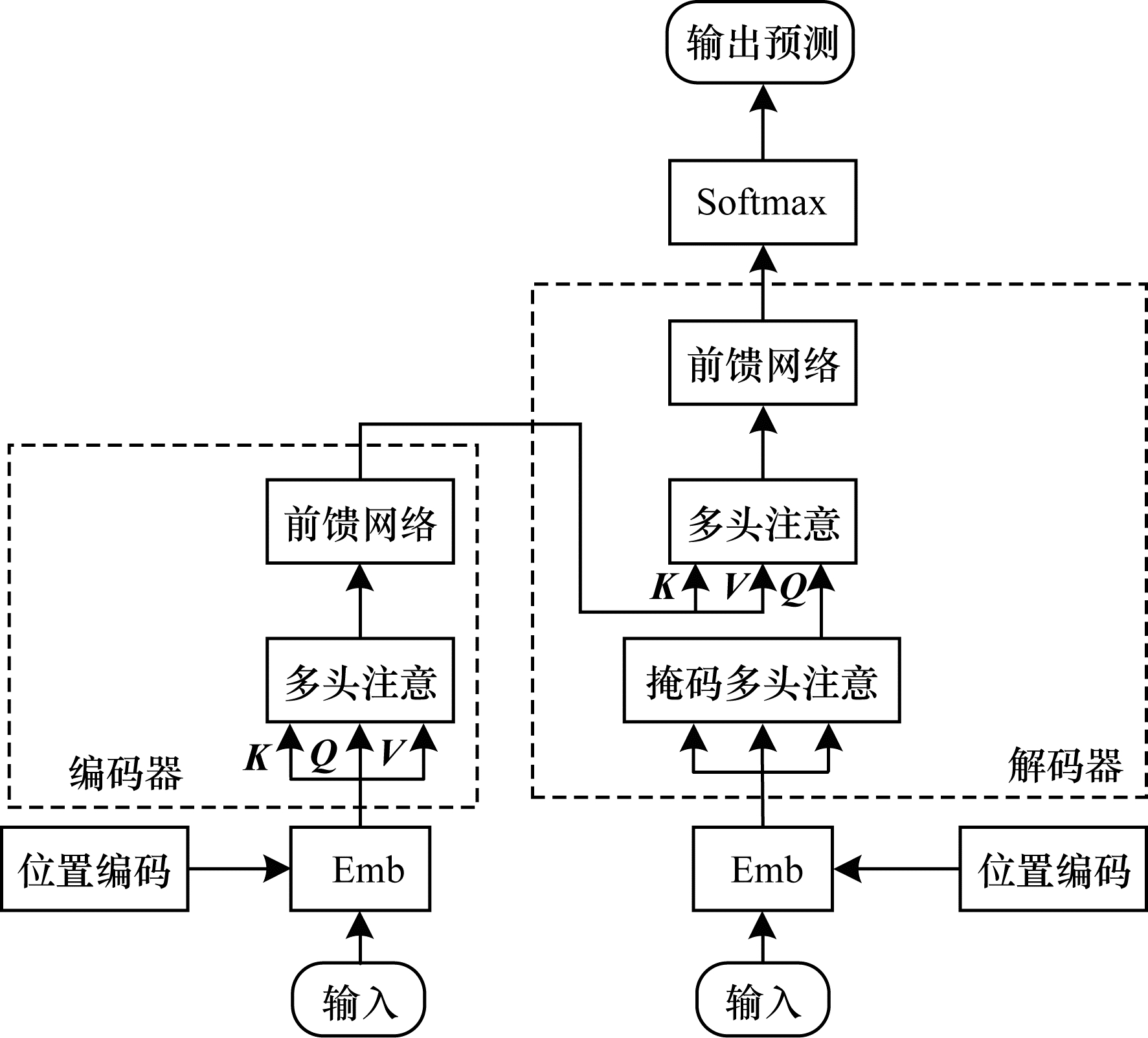 解码器层还包含全连接层前馈网络,编解码器多头注意的输出经过残差连接及归一化Add & Norm进行归一化数据,再通过一个线性层和Softmax操作后,得出概率值最大的词即为t时刻的预测结果