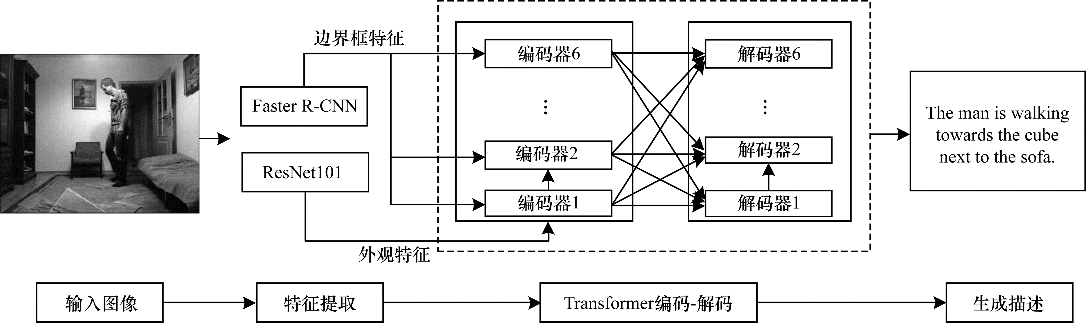 2 图像描述模型本文提出的基于对象关系网状转换器的图像描述模型的总体流程如图 3所示。首先使用自底向上注意力机制模型提取图像外观特征和边界框特征,然后将上述特征输入到改进的转换器模型中进行编解码生成描述。分别对模型的编码器和解码器部分进行改进,通过将外观特征和边界框特征合并为对象关系特征,从而改进编码器自我注意力层的注意力权值,使得模型利用到空间关系信息。将编码器和解码器的连接设计为网状结构,让每层编码器与解码器相连接,使得模型充分利用图像特征,并生成更为全面准确的图像描述。