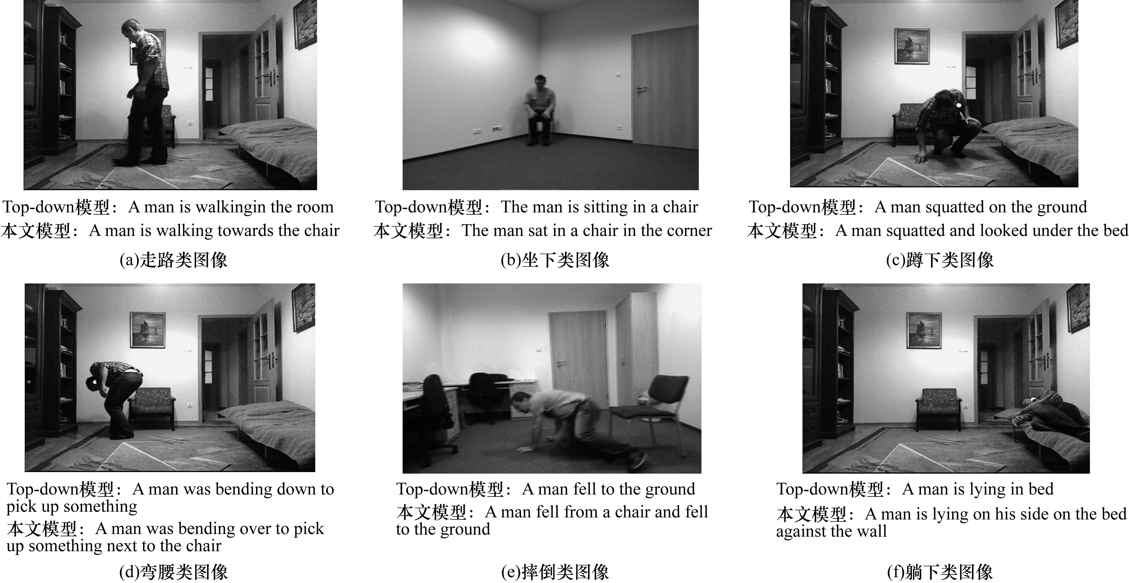 为进一步验证本文模型效果,本文进行大量主观对比实验。将基于Top-down模型和本文模型生成的图像描述进行对比,结果如图 7所示。图 7(a)中的Top-down模型描述出人走进房间,而本文模型进一步描述了人和椅子的关系,即人在朝着椅子走;图 7(b)中的Top-down模型只描述出人坐在椅子上,本文模型还正确描述出椅子和墙的相对位置关系,即人坐在墙角的椅子上;图 7(c)中的Top-down模型描述出人蹲着,本文模型则在细节上描述出人正在朝着床底看;图 7(d)中的Top-down模型描述出人弯腰捡东西,本文模型在细节上描述了人与椅子的相对位置关系;图 7(e)中的Top-down模型描述出人摔倒在地上,而本文模型进一步描述出人摔倒时所在的位置;图 7(f)中的Top-down模型描述出人躺在床上,而本文模型准确定位到床的位置并注意到人在侧身躺着。综上所述,本文模型生成的描述在对象关系以及位置关系等细节上表现更佳,且语义更加全面丰富。
