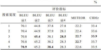 如表 1所示,随着搜索宽度的增加,BLEU@N和METEOR的评分也会增加,这表明模型性能更好。评价指标中的CIDEr是专用于图像描述的评价指标,结合图 6和表 1可以看出,当搜索宽度数值设置为3时CIDEr值最大,且其他指标也相对较大,这表明此时模型效果最好。