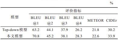 为验证本文模型中对象关系网状转换器对生成图像描述的影响,在实验中将基线模型中基于单一注意力的自上而下图像描述生成模型Top-down[9]和本文基于对象关系网状转换器模型进行对比,结果如表 2所示。结果表明,本文提出的对象关系网状转换器模型生成的描述评分比Top-down模型分别提高了7.6、1.1、0.2、2.1、0.8和3.7个百分点。