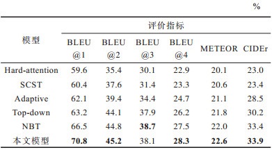 为验证本文模型的性能,使用上述客观评价指标对本文模型生成的图像描述进行评价。本文模型与Hard-attention[3]、SCST[28]、Adaptive[6]、Top-down[9]和NBT[8]模型评价指标对比结果如表 3所示。其中,最优结果加粗表示。Hard-attention引入了注意力机制,使得不同时刻的特征动态输入到语言模型生成描述。SCST(Self-Critical Sequence Training)是基于自临界训练序列生成描述,采用强化学习的方法优化图像描述问题。Adaptive是基于带有视觉哨兵的自适应注意力机制的图像描述模型,由模型决定是依赖图像还是视觉哨兵生成图像描述。Top-down是基于自上而下与自下而上相结合的注意力模型,该模型在目标物体或者图像的其他显著区域上计算注意力权值。NBT(Neural Baby Talk)是生成一个句子模板,将模板中的空缺与图像区域相关联,并将图像中检测到的目标物体嵌入到句子模板中来生成图像描述。