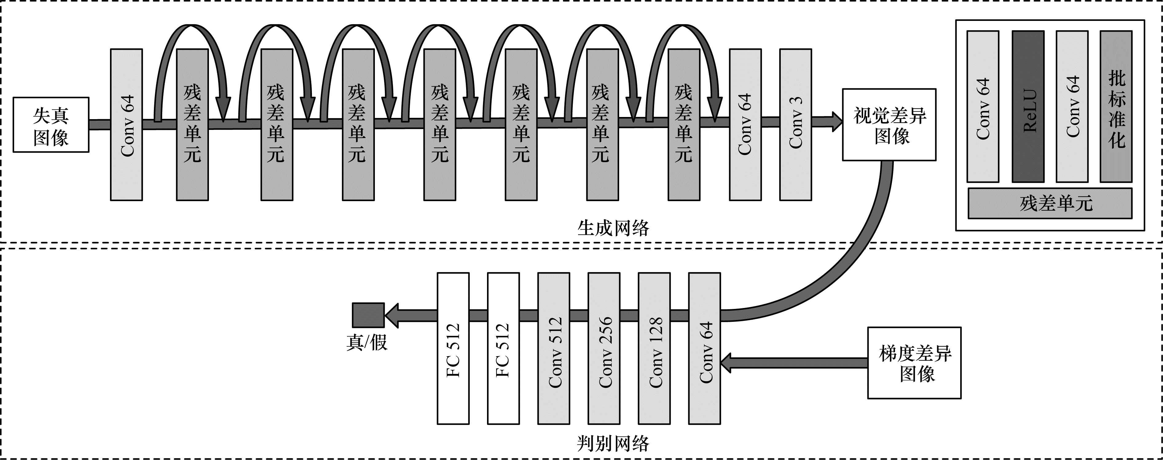生成网络G是为了使得网络输出结果更接近于真实视觉差异,这主要体现在像素等级和视觉等级2个方面。当给定一组失真图像