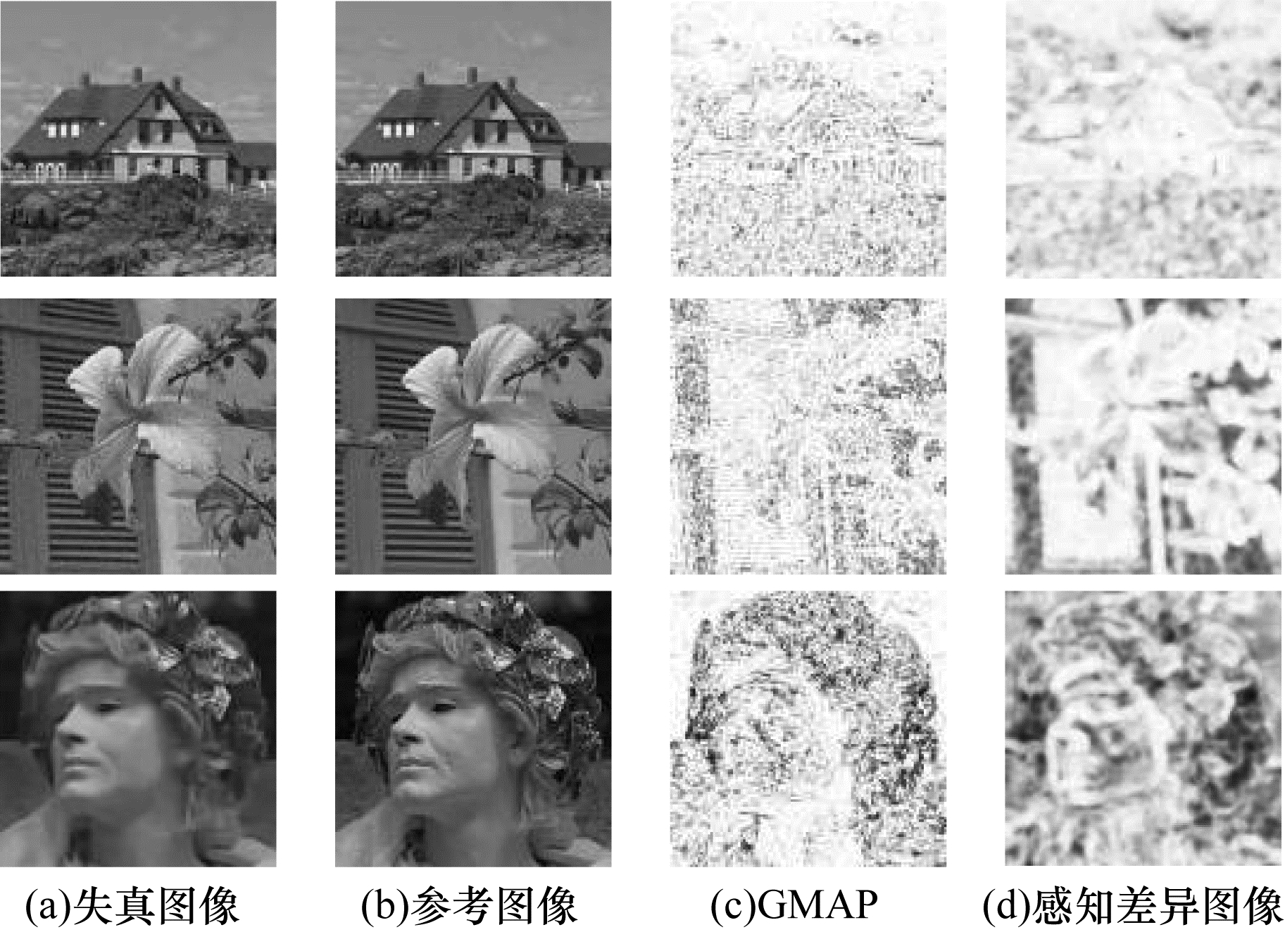 图 3给出了训练好的生成网络产生的视觉感知差异图像与其他图像之间的对比效果。从图 3可以看出,在特定失真的情况下,该模型能够较好掌握图像的失真特性,并对质量评价网络起到促进作用。