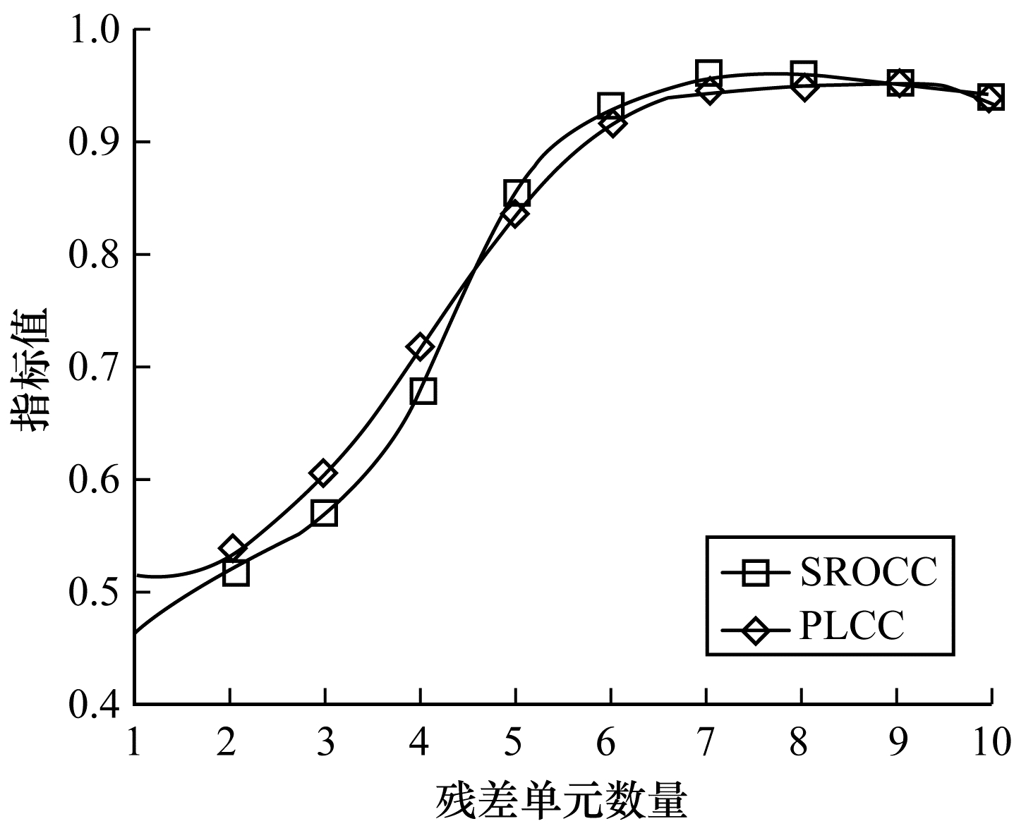 深度学习在人脸识别、机器翻译等各项任务中取得显著效果,这是因为足够深的网络深度起到关键作用,一定的网络深度可以产生更好的非线性表达能力,并且可以学习到复杂性更高的细节图像特征。本文模型使用具有7个残差单元网络生成图像的感知差异图像,并采用不同网络深度在CSIQ数据库上进行图像质量评价性能对比,结果如图 5所示。从图 5可以看出,网络深度的加深可有效提升模型性能以及对失真图像的评价能力,但是当残差单元数量达到7个后,网络深度的加深对性能影响不显著,且还会引起更为复杂的网络优化问题以及增加网络参数量和模型时间复杂度。因此,本文选择使用7个残差单元来构建生成网络。