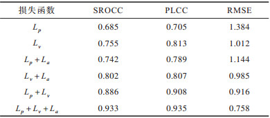 3.2 基于不同损失函数的消融实验结果对比分析为了研究模型中关键部分的有效性,本文在TID2008数据库上进行基于不同损失函数的消融实验。实验将采用不同损失函数生成的感知差异图像和失真图像输入至同一图像质量评价网络中,用SROCC、PLCC以及RMSE值来体现不同损失函数对GDA-NR-IQA性能的影响,结果如表 1所示。其中,