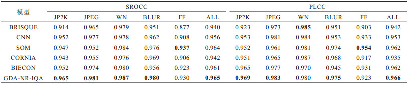 在现实应用中,失真图像通常不仅只有一种失真,而是多种失真结果之间相互产生影响造成的。不同的失真类型都有其独特特点,为研究GDA-NR-IQA在不同失真类型下的精度问题,将提出的本文模型与BRISQUE[26]、CORNIA[27]、CNN[17]、SOM[28]和BIECON[20]这5种具有代表性的NR-IQA模型在LIVE数据库中进行基于不同失真类型的实验对比,结果如表 2所示。其中,最优结果加粗表示。从表 2可以看出,除了快速衰落失真(FF)外,针对其他4种失真,GDA-NR-IQA比其他模型的准确性高,这也说明本文模型具有良好的优越性。同时,在LIVE数据库中的整体性能表明,GDA-NR-IQA在多重失真的情况下还能通过有效生成感知差异图像对失真图像的质量分数进行预测。