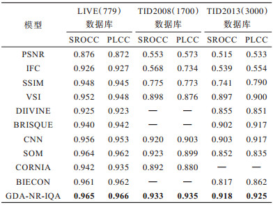为进一步验证GDA-NR-IQA的有效性,在LIVE、TID2008和TID2013这3种主流图像质量评价数据库中,实验对本文模型与PSNR、IFC、SSIM和VSI这4种FR-IQA模型以及DIIVINE[29]、BRISQUE、CNN、SOM、CORNIA和BIECON这6种代表性NR-IQA模型进行对比分析,结果如表 3所示。其中,最优结果加粗表示。从表 3可以看出,GDA-NR-IQA在3种数据集上的结果优于其他模型。从表中还可以看出,本文模型在LIVE数据库中评价结果的提升效果并不明显,而在TID2008与TID2013数据集中相比其他模型提升了1个百分点以上,这主要是因为LIVE数据库具有较少的失真图像数据量,在计算预测分数与主观评分之间的相关性时,由于测试样本过少使得模型的提升效果不显著,且该模型在后两种数据库中的评价结果则能更好地反映出模型整体性能的优越性。而针对本文提出的模型,发现其在TID2008和TID2013数据库中的相关性结果相比于LIVE数据库都出现了明显下降,这主要是因为前两种数据库的失真类型和失真图像的数量均远大于LIVE数据库,而GDA-NR-IQA在TID2013数据库中SROCC和PLCC也分别达到了0.918和0.925,相比于其他评价模型也提升了1.5个百分点以上,这表明GDA-NR-IQA在更加复杂的失真类型和更大的失真数据量下,也能够获得良好的精度。