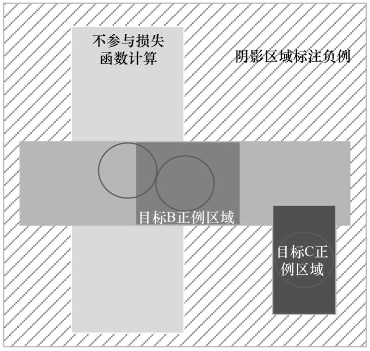 1.1.1 正例区域原则针对正例与负例的划分提出了正例区域原则,其规则为:取部分每个标签框的中心位置到该标签框4条边的距离作为正例区域。假设原标签框高大于框宽,若原标签框的框高大于等于448,则取标签框高的1/3作为正例区域的高;若原标签框高大于等于224小于448,则取标签框高的1/2作为正例区域的高;若原标签框高小于224,则取标签框高作为正例区域的高。正例区域的宽遵循近似原则,不同之处是若标签框宽已经小于正例区域的高,则以标签框宽直接作为正例区域的宽。假设原标签框宽大于框高,则标签框宽首先按照上述规律计算获得正例区域的宽,接着换算正例区域的高,若标签框高小于正例区域的宽,则以标签框高直接作为正例区域的高。