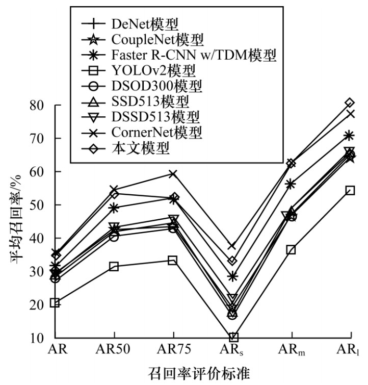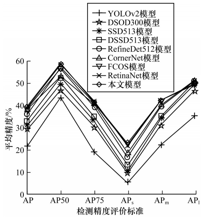 从图 5、图 6可以看出,与基于锚点的经典单阶段检测模型(YOLOv2与DSSD513)以及无锚点的新型单阶段检测模型(Cornernet与FCOS)相比,本文模型的平均精度更优。虽然基于锚点的双阶段检测模型拥有比单阶段模型更复杂的结构与训练方式,但其精度水平与单阶段模型精度相当。在目标类别上,模型对大型目标的检测效率最优,其次是中型目标,而对小型目标的检测效果最差。