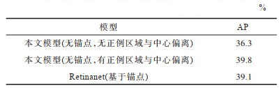 2.3.1 正例区域原则与中心偏离的效果本文提出的无锚点检测模型使用正例区域原则与中心偏离技巧可以有效提高最终检测精度,正例区域平衡不同大小检测目标的对应坐标点的个数,并优化坐标点落点的分布。中心偏离赋给低质量的远离目标中心检测框较低的置信度,降低错误可能性较高的预测检测框通过非极大值抑制的几率。如表 2所示,正例区域原则与中心分离分支可以提高模型检测精度近4个百分点,这说明正例区域原则与中心偏离支路可使得模型的精度超过了经典的基于锚点的模型Retinanet。