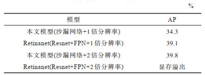 本文提出的沙漏型单线程网络结构具有与Resnet+FPN结构模型相当的语义特征表征能力,且可节省大量的内存空间。节省的空间可以提高初始输入图像与最终用于检测特征图的分辨率,并进一步提升模型的特征提取与表征能力,从而保证了模型能够维持小型物体的预测精度。从表 3可以看出,沙漏网络+2倍分辨率模型结构的检测精度高于Retinanet,而Retinanet使用2倍分辨率的特征图则会出现内存溢出问题。