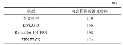 本文模型兼具较少计算量与较低模型复杂度的优势,使得预测图像的推理速度得到了提升。通过在1.1节与1.2节中对模型进行改进与精简,本文所提模型对每张图像的推理时间为149 ms,这主要是因为:1)模型没有采取现有常见的多阶段预测模块特征金字塔网络FPN,这种预测模式类似于双阶段检测模式,不符合人类视觉认知的方式,同时模块会增加计算量与权重参数;2)模型没有采取锚点可减少大量锚点的相关计算量。由此可见,本文模型的复杂度与推理计算量远低于传统基于锚点的FPN预测头模型。