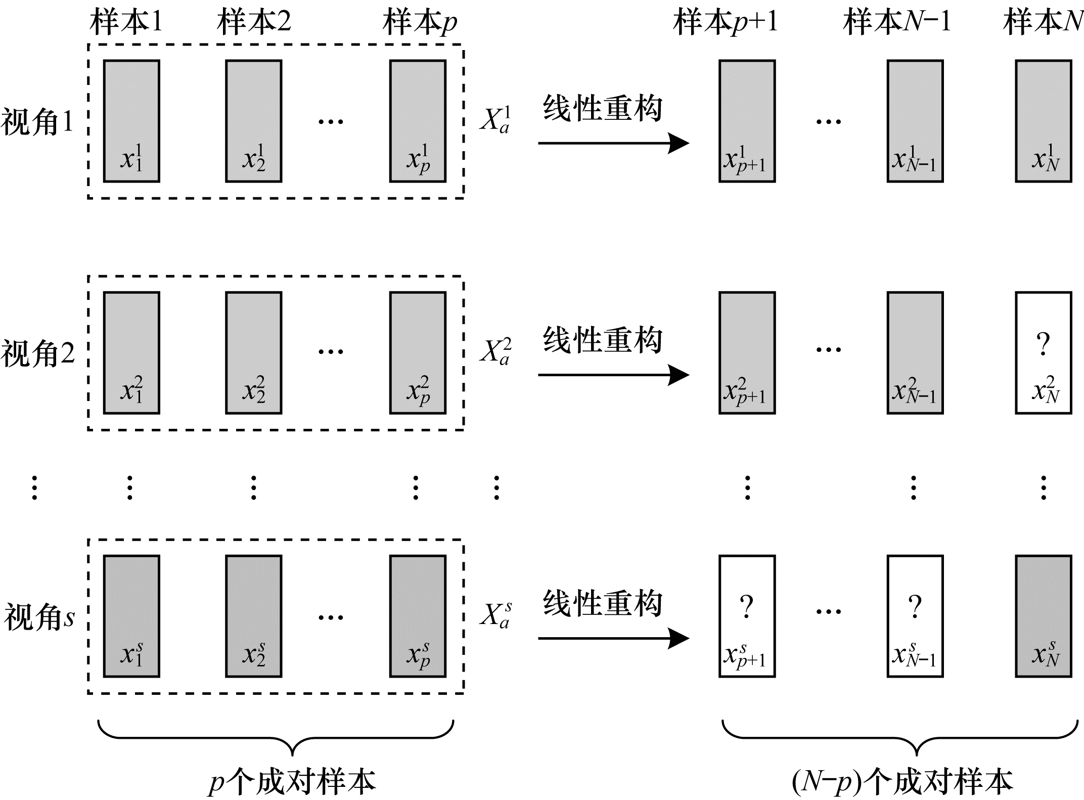 本文方法是一种两阶段方法。第一阶段线性重构缺失样本,第二阶段求所有视角在