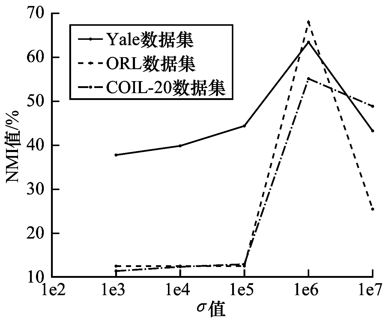 | 图 7 Yale、ORL和COIL-20数据集上NMI随σ变化的折线 Fig. 7 Line chart of NMI changes with σ on Yale, ORL and COIL-20 datasets | |