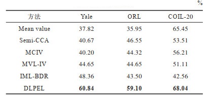 从数据集的图像中提取出灰度值强度(GSI)、方向梯度直方图(HOG)和局部二元模式(LBP)3个视角的特征,得到3个完整的多视角数据集。为去除原始特征的冗余信息,利用主成分分析(PCA)对数据预处理。通过构造不完整数据集,随机选取70%的样本作为成对样本,然后在每个视角剩余的样本中分别选取10%的样本用1填充。由于MCIV要求至少有一个完整视角,因此在第2个、第3个视角中选取15%的样本作为缺失样本,并用1填充。