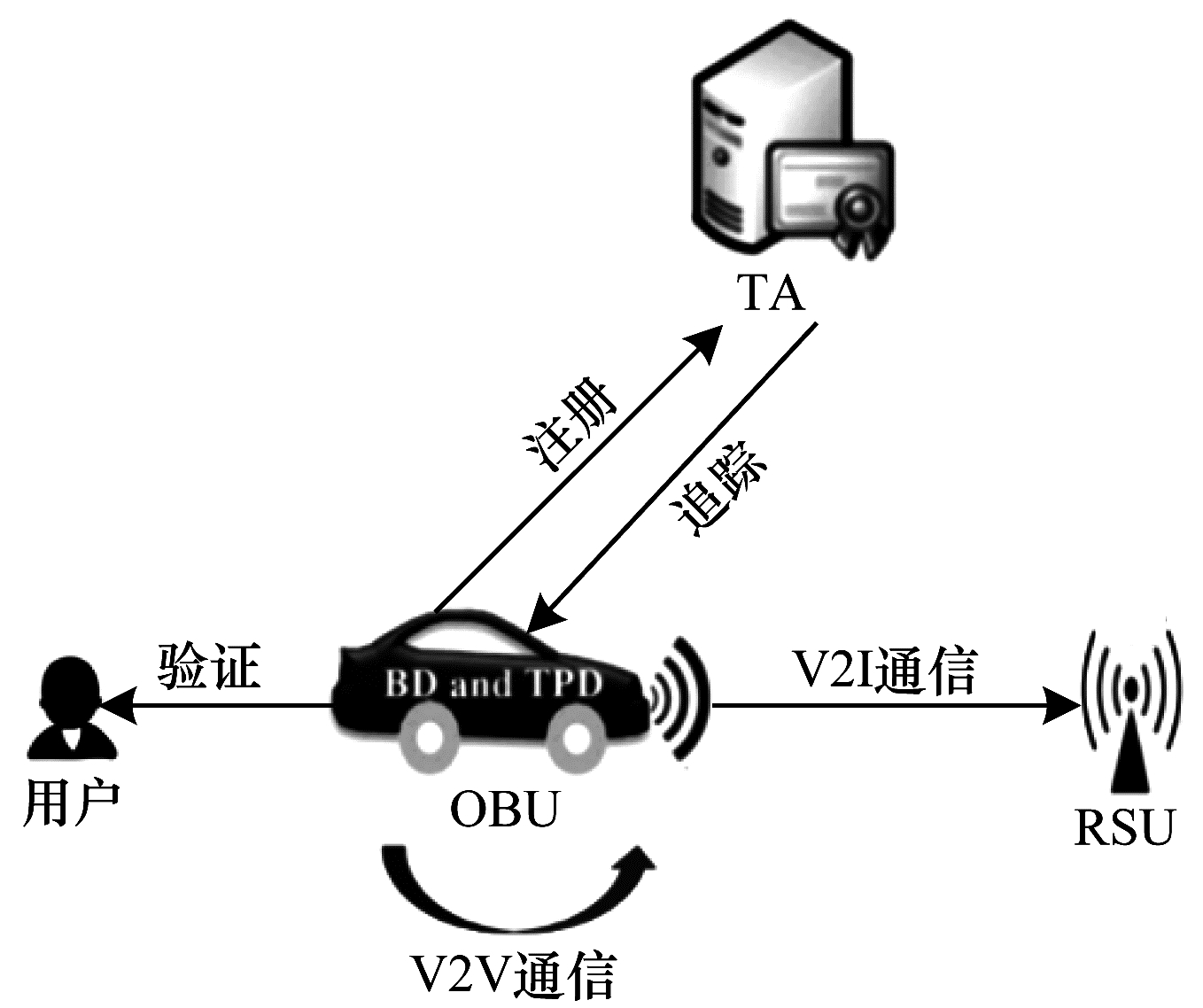 2)OBU包括生物设备(Biometric Device,BD)和防篡改设备(Tamper Proof Device,TPD)。BD用于存储生物信息;TPD用于存储密码材料。现有技术可保证TPD不可篡改且不可通过暴力手段获取其中信息。所有联网汽车均安装电子单元OBU。