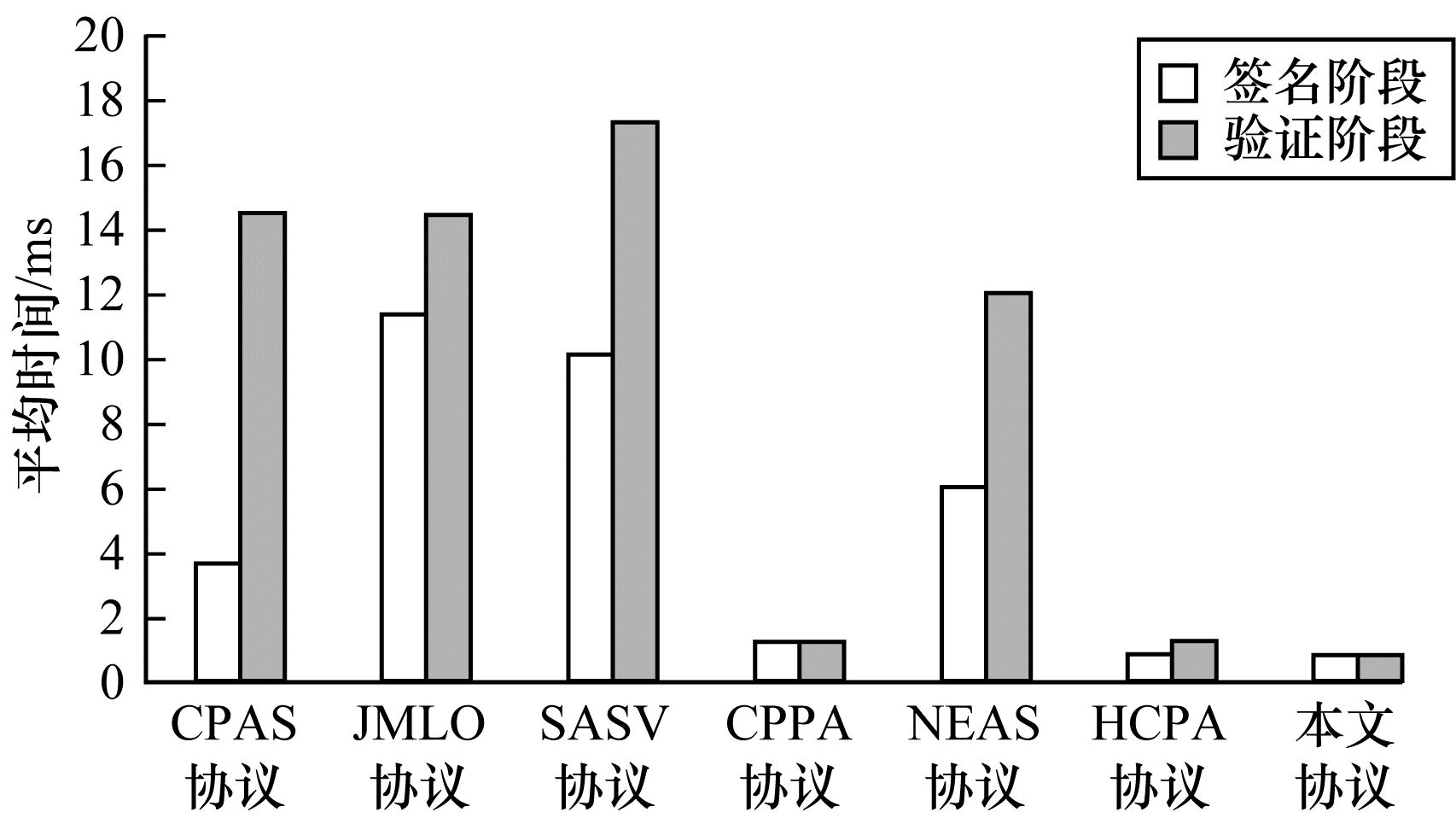 由表 2和表 3的结果绘制本文协议与其他对比协议的消息签名验证计算开销对比图,如图 2所示。可以看出,本文协议签名验证阶段的计算量小于所有对比协议。