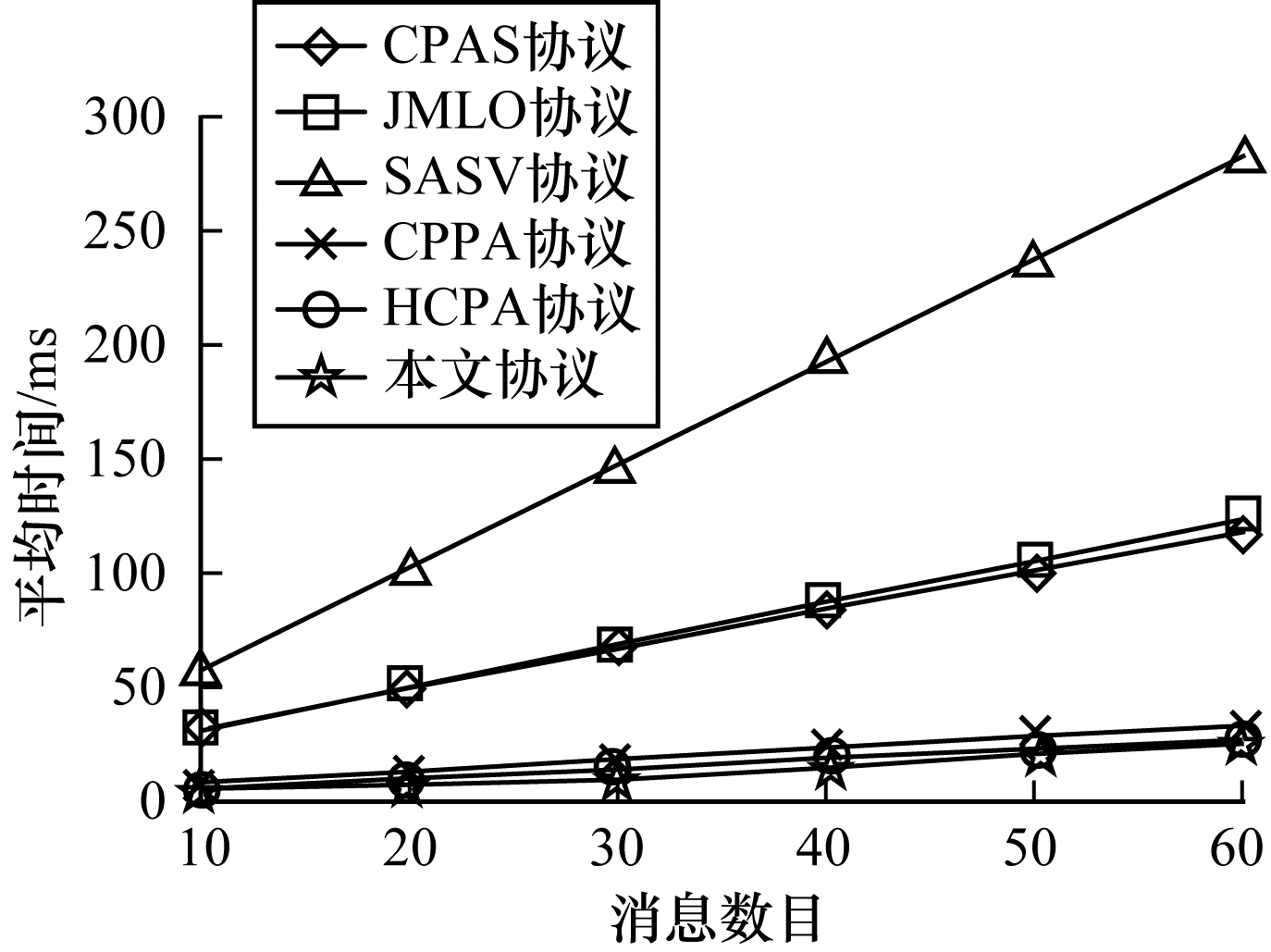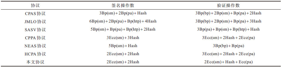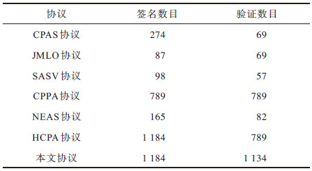 每秒执行本文协议和其他协议所得的签名和验证消息的数目如表 4所示。可以看出,本文协议相较于其他对比协议在单位时间内可签名和验证的消息数量更多,表明其效率更高,这是因为本文协议是基于ECC设计的,与基于双线性配对的方案相比更为高效。