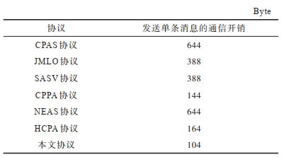 对不同协议的通信负载进行对比,如表 6所示。可以看出,对比协议大多基于双线性配对来实现,通信负载较高,而本文协议发送单条消息的负载相对较低。