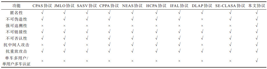 对本文协议与现有协议进行功能对比。除基于身份设计的方案之外,还将本文协议与基于PKI的协议IFAL[27]、基于对称密码的协议DLAP[15]和基于无证书的协议SE-CLASA [24]进行对比,如表 7所示,其中,√表示满足该性质,×表示不满足该性质。可以看出,本文协议在满足匿名性、不可伪造性、强可追溯性、不可链接性和抵御中间人攻击这5个安全目标的前提下,同时还适用于单车多用户和单用户多车的应用场景,并且还可抵御重放攻击,具备不可否认性。本文协议是表 7所有协议中唯一满足匿名性、不可伪造性、强可追溯性、不可链接性、不可否认性、抵御中间人攻击、抵御重放攻击,并且适用于单车多用户或单用户多车应用场景的协议。