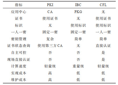 CFL认证体制是应用去中心化、可自认证、可实现可信认证以及可实现主动防御的认证技术[5],该认证体制还具有隶属轻量级、应用去存储化、一人一密、支持统一认证、跨域认证、支持安全进程认证和动态认证等技术优势[34]。CFL作为底层信息安全技术可广泛应用于信息产业中[3],可为各种信息产业提供安全保障,因此CFL可满足各种信息产业对毫秒级信息安全认证的迫切需求。CFL与PKI、IBC的属性对比分析如表 3所示。