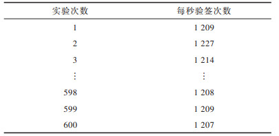 如表 6所示,证书签名验证进行了600次测试,输出每秒验签次数,平均验签速度为每秒1 204次。