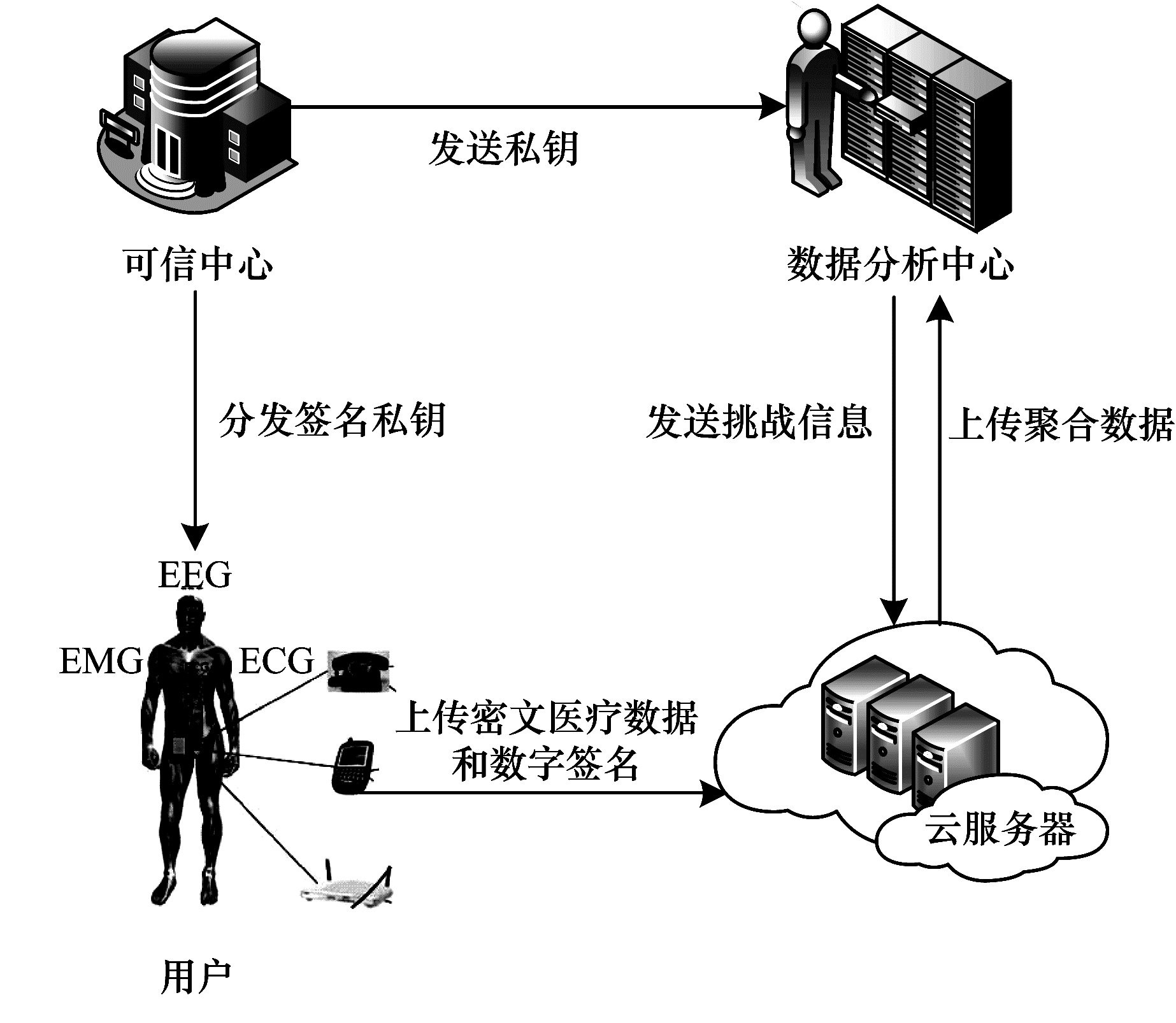 2)云服务器。拥有巨大的计算和存储能力,在本模型中主要用于存储用户上传的加密数据及数字签名集合。一旦接收到医疗数据分析中心的挑战请求,云服务器会对挑战位置的加密数据及数字签名进行同态聚合运算,并返回最终结果到医疗数据分析中心。