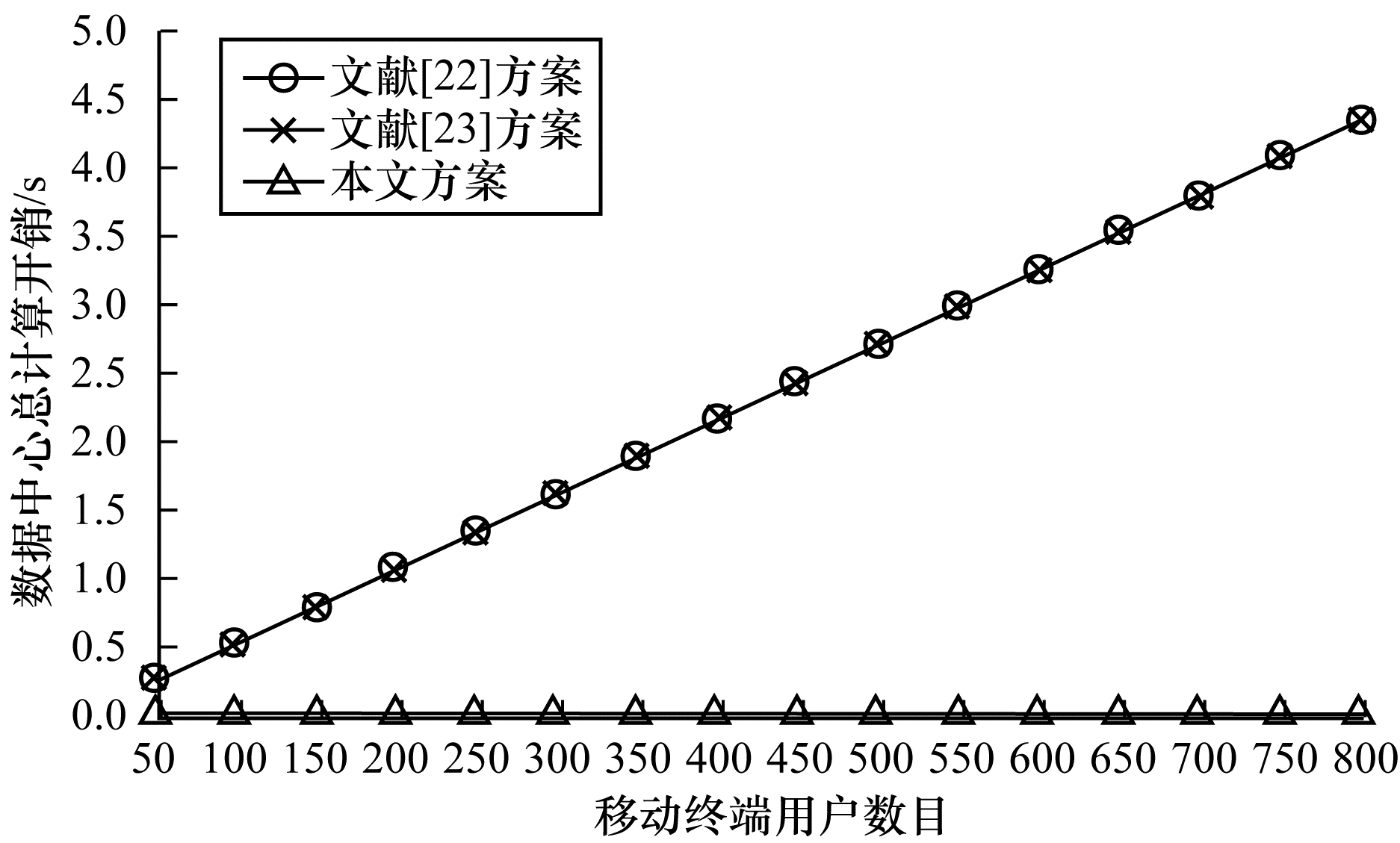 从图 3可以看出,本文方案医疗数据分析中心在计算效率方面具有明显优势,特别地,随着移动终端用户数目N的增加,文献[22-23] 方案的计算开销均呈线性增长,而本文方案医疗数据分析中心的计算开销保持恒定轻量级常量,并未随着移动终端用户数目N的增加而增加。