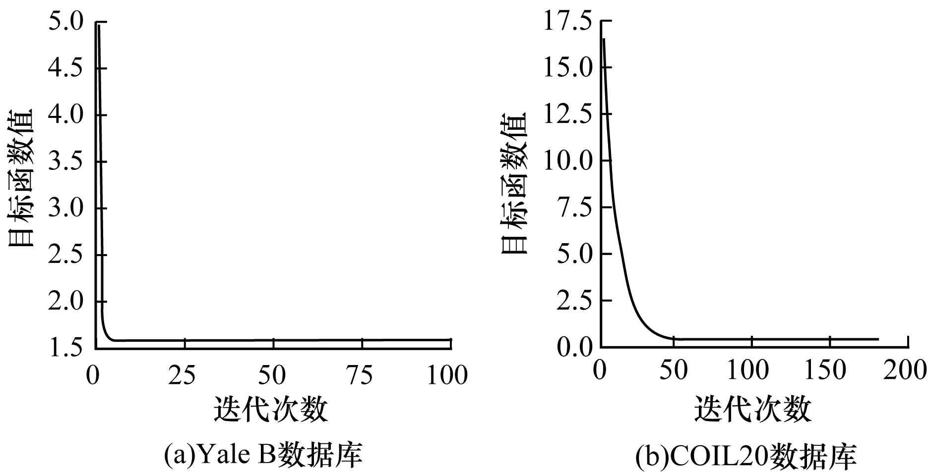 为验证交替优化策略的收敛性,在Yale B[19]人脸数据库和COIL20[20]数据库上进行一组实验。图 1显示了本文算法的目标函数值在这两个数据库上迭代次数的变化,可以看出,目标函数值随着迭代次数的增加而稳定下降。