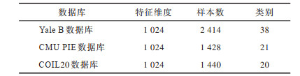3.1 实验数据库在Yale B人脸数据库、CMU PIE人脸数据库[23]和COIL20图像数据库上验证本文算法的分类性能。3个数据库的示例样本图像如图 2所示,其中每个对象的任意10张或20张图像都被用作训练样本,每个对象的其余图像被用作测试样本,具体设置如表 1所示。