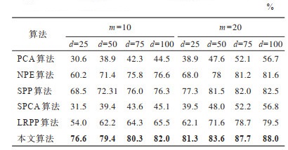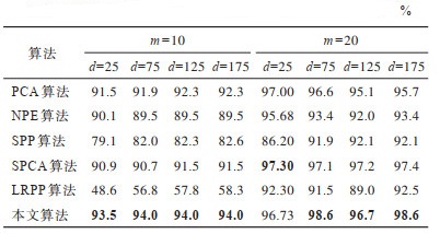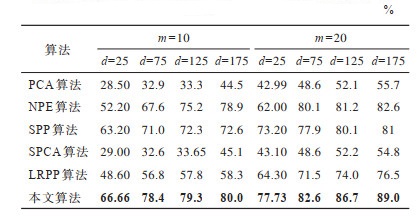 为评估本文算法的有效性,将其与目前主流的特征提取算法PCA、NPE、SPP、SPCA[21]和LRPP[22]进行比较。这些对比算法在提取观测数据的特征后都使用最近邻分类器执行分类任务。为进行公平比较,每种算法在测试数据库上独立运行5次。此外,对比算法的参数设置参考其文献出处或手动调整为最佳。