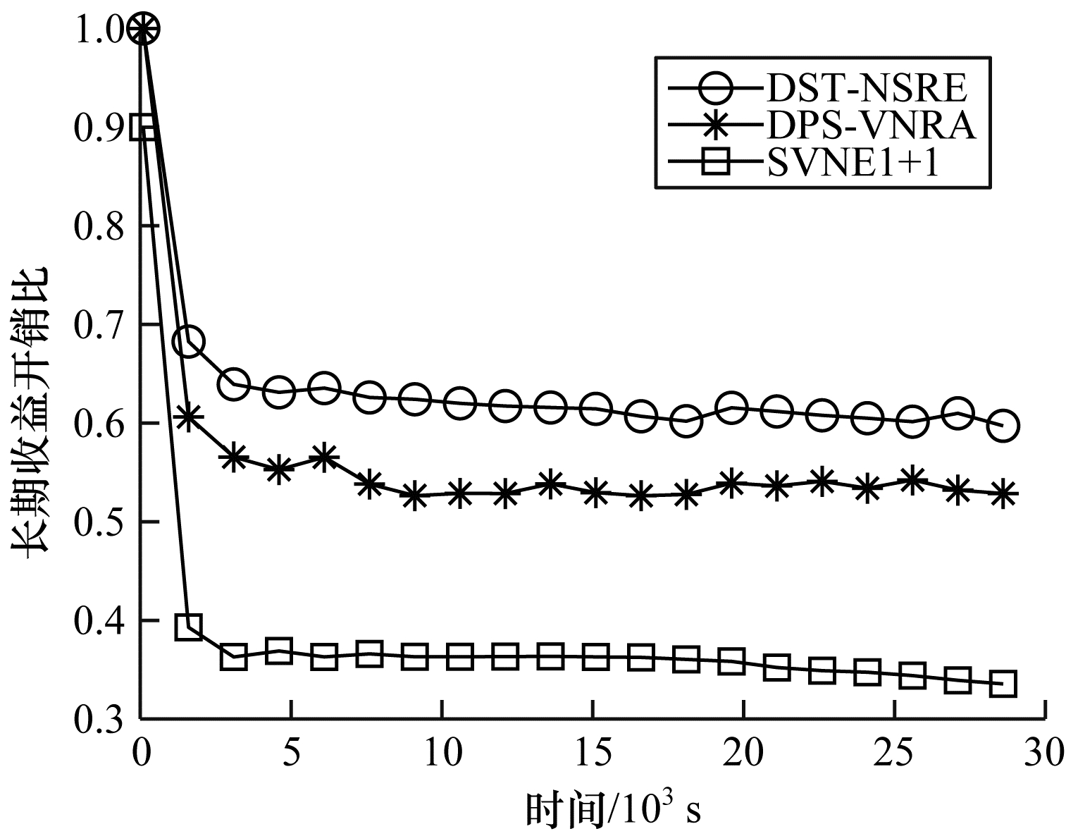 3种算法的长期平均收益开销比如图 3所示。可以看出,长期平均收益开销比随着时间的增长出现不同程度的下降,最终趋于稳定。DST-NSRE算法能够获得更高的收益开销比,这是因为该算法对故障的虚拟链路按带宽进行排列,优先恢复价值更高的高可靠性低时延切片,增加了网络收益,并且对备份资源的合理共享减少了资源消耗,使网络资源开销减少。此外,算法在重映射时选择可靠性高的底层链路,提高了恢复率,减少了因故障恢复失败而产生的罚款,从而提高了长期收益开销比。