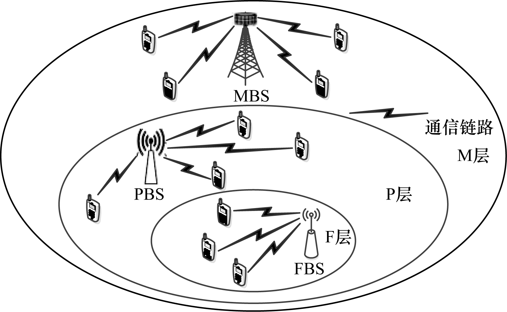 1 网络建模本文考虑一个三层异构蜂窝网络,如图 1所示,其中,第1层、第2层和第3层分别由MBS、PBS和FBS组成,分别称为M层、P层和F层。所有MBS都配有大规模多输入多输出(Multiple-Input Multiple-Output,MIMO)天线